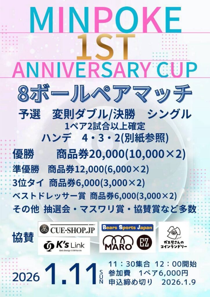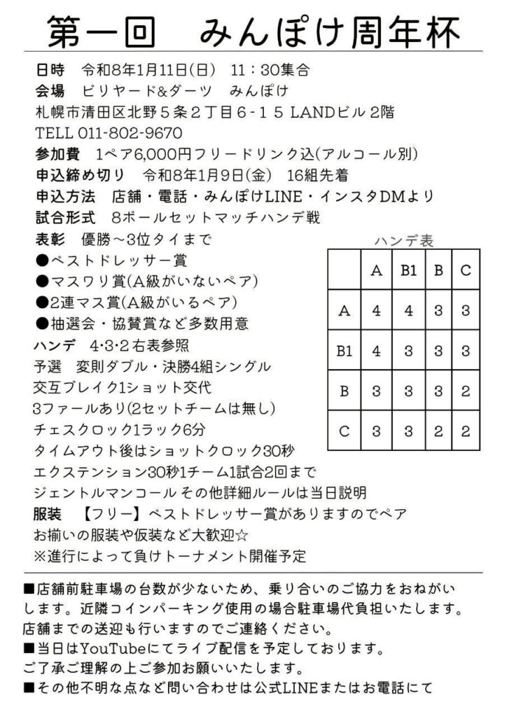 1月11日 1周年記念ペアマッチ大会を開催します 2025年12月15日 最終更新日時 : 2025年12月15日 minpoke FacebookXCopy みんぽけ1周年ビリヤード大会を開催します。 エイトボールのペアマッチとなります。 ペアが見つからないという方はお店までご連絡ください。 定員がありますのでエントリーはお早めに! ベストドレッサー賞なんかも用意してみました。 Follow me! @minpoke_sapporo FacebookXCopy