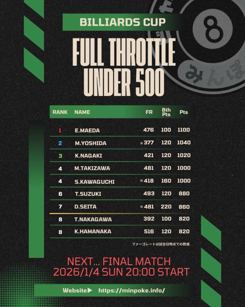 BC級戦の位置付けとなる年間ツアー戦「フルスロットルカップ」の最終戦となる第8戦の結果です。