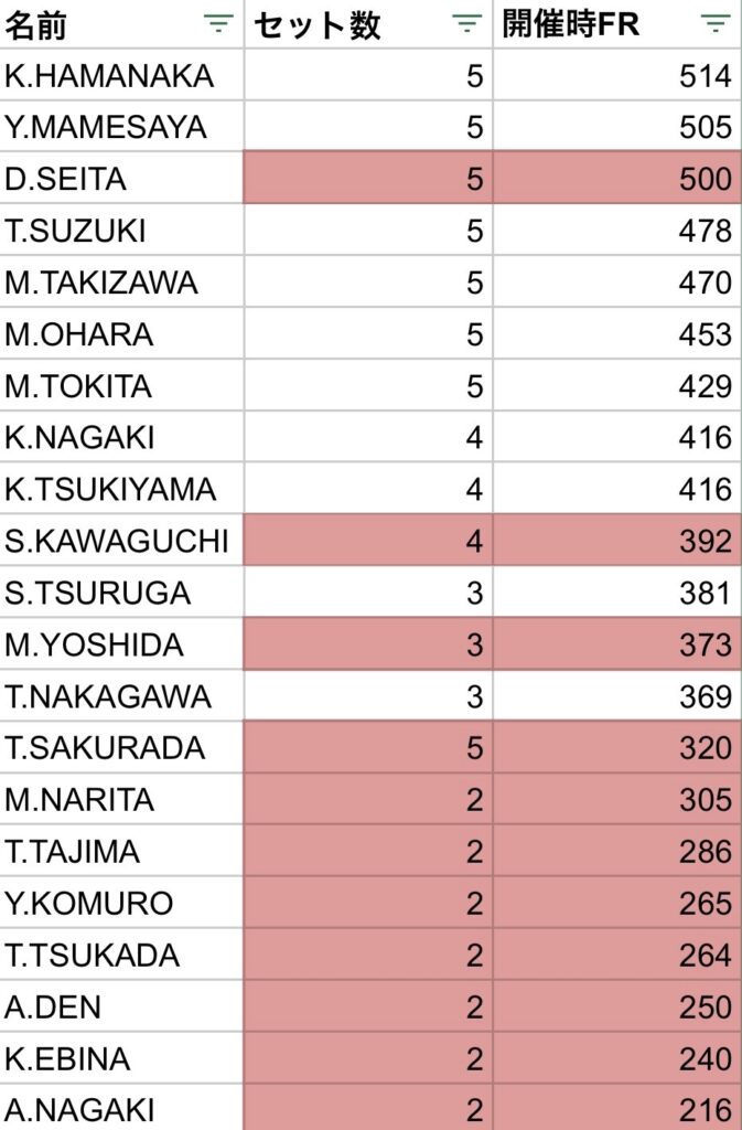 参加者のfargorateとセット数(赤字は200セット未消化)
